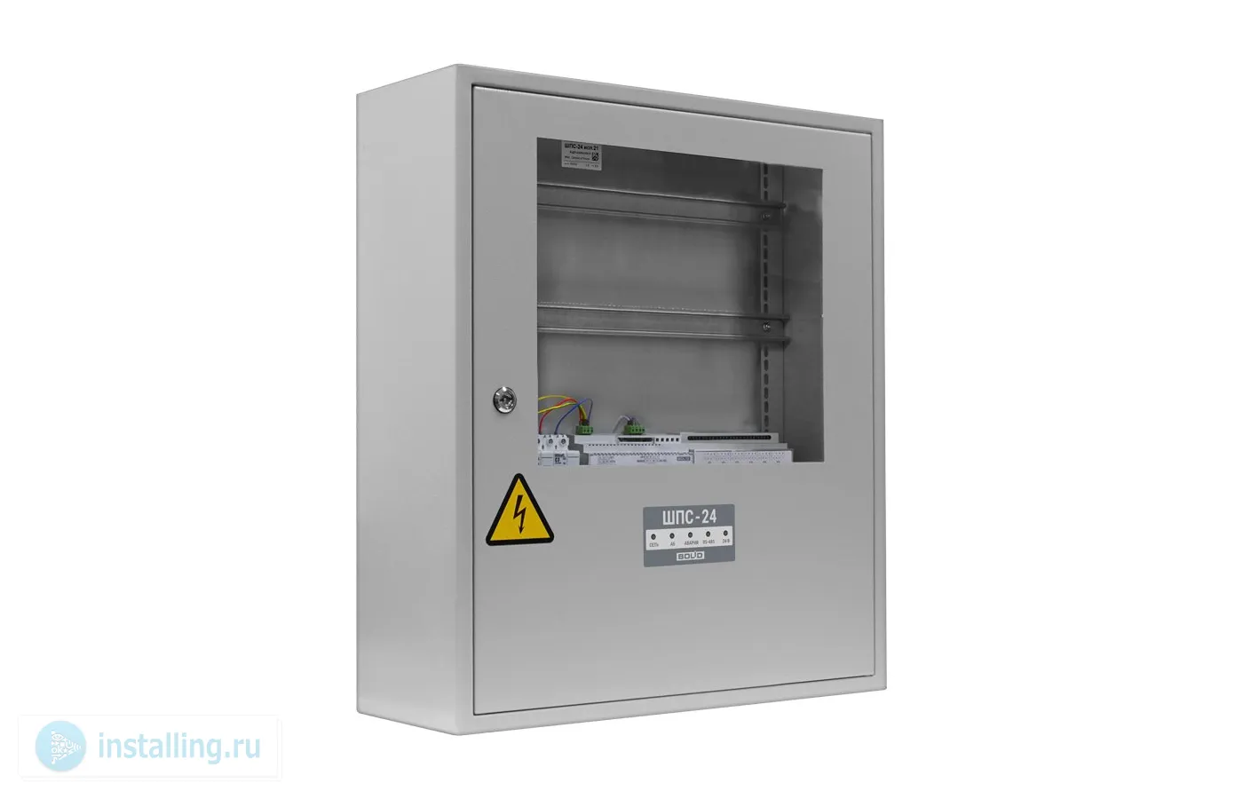 Шкаф для монтажа средств пожарной автоматики с креплением на DIN-рейку; 2 ввода питания; U-вх.180…265 В, U-вых.27.2±6 В, I-ном.3 А, I-макс.3.5 А, под два АКБ 12 В 26/40 А·ч; встроенный блок коммутации БК-24-RS485 (две изолированные линии интерфейса RS-485 для подключения к компонентам ППКП и ППКУП расположенным за пределами ШПС, одна линия RS-485 для подключения компонентов ППКП внутри ШПС; 7 выходов для подключения к приборам внутреннего интерфейса RS-485 и 7 выходов питания; IP41, t-раб.-10…+40°С, 700?600?225 мм. Дверь с прозрачным стеклом.