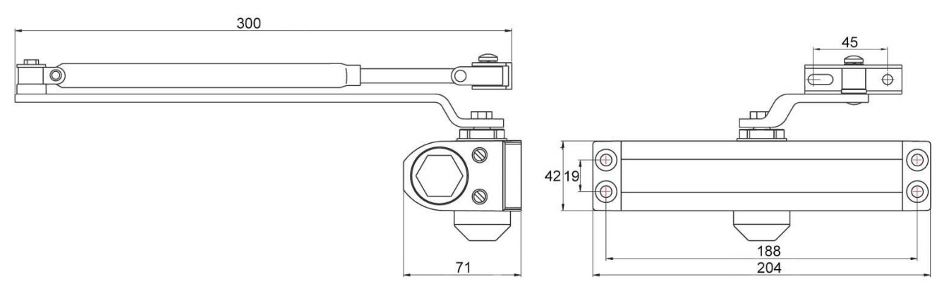 Доводчик для дверей весом до 85 кг, двухскоростной, с фиксацией открытого положения, установочный размер 188х19 мм, габариты 42?204?71 мм, -45...60°С, цвет - серебро