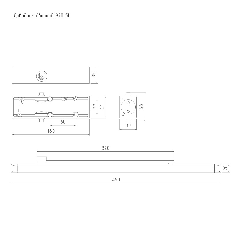 В плоском корпусе со скользящей тягой для дверей весом от 25 до 70 кг, класс доводчика EN2-3, монтажные размеры - 60х38 мм, -45...+60°С, 180х68х39 мм. Цвет-серебро.