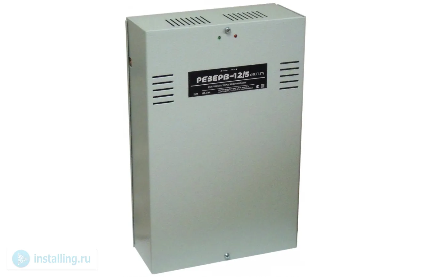 U-вх. перемен. 165...275 В, U-вых. пост. 13.4...14.0 В, I-ном. 5 А, I-макс 6 А, под аккумулятор 12 В 17 Ач; световая индикация режимов работы Сеть, АКБ; выход ОК наличие сети 220 В, защита от короткого замыкания, защита аккумулятора от глубокого разряда, t-раб. -10...+40°С, габ. размеры 200х312х85 мм