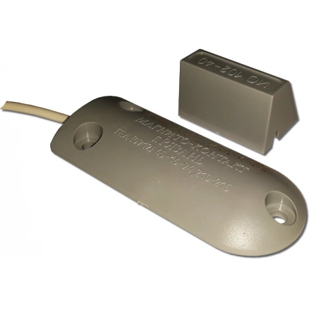 Магнитоконтактный, накладной, для металлических поверхностей, кабель в пластиковом гофрорукаве, НР геркон, зазор до 30 мм; U-коммут.до 72 В, I-коммут.до 500 мА, P-коммут.10 Вт; IP55, t-раб.-50...+50°С, 90х40х10.4 мм. Пластиковый корпус.