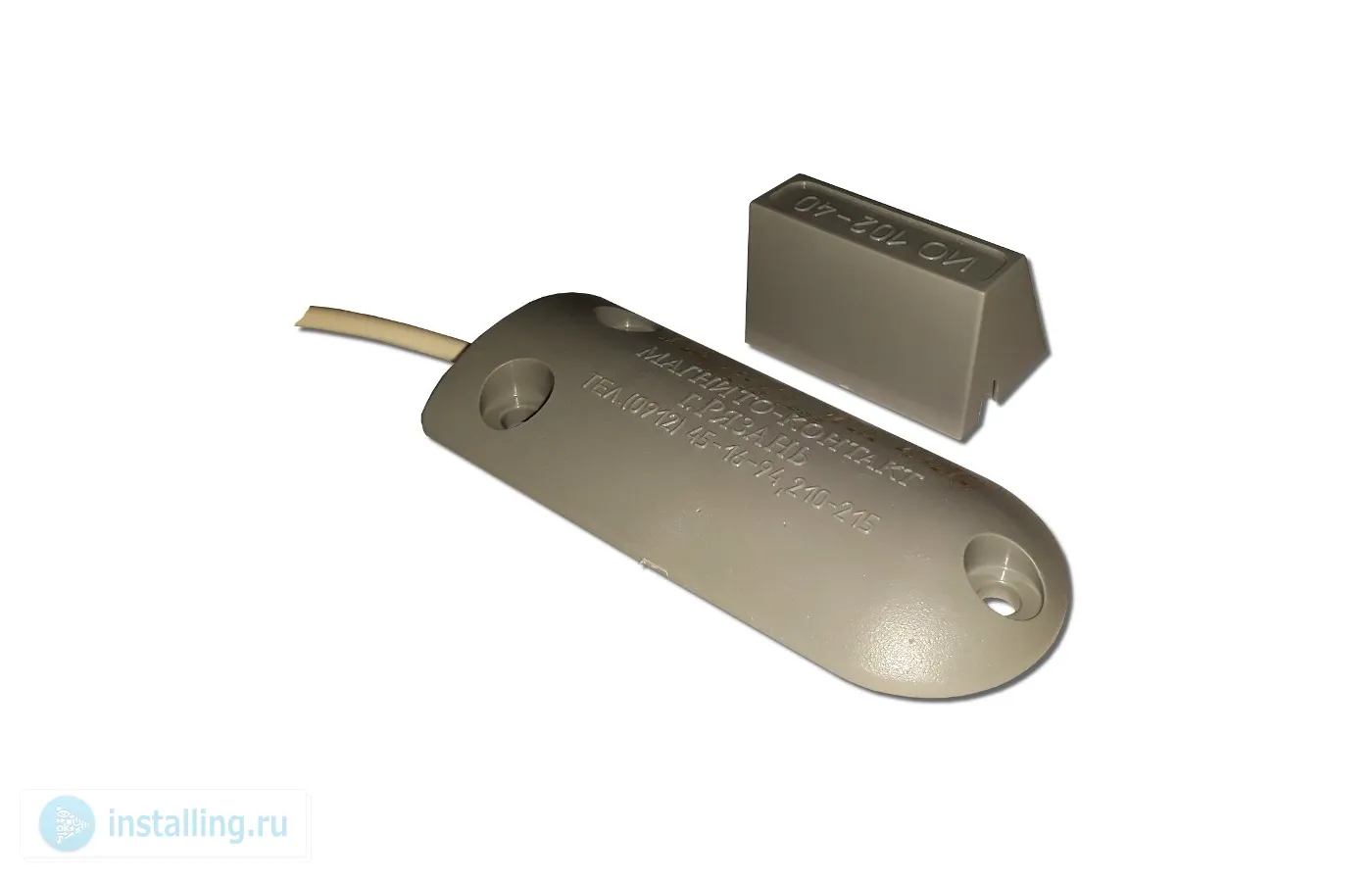 Извещатель охранный точечный магнитоконтактный ИО 102-40 предназначен для блокировки гаражных ворот, ангаров, железнодорожных контейнеров, телефонных шкафов и других конструктивных магнитопроводящих (металлических) и магнитонепроводящих (алюминиевых, деревянных и т.д.) элементов зданий и сооружений на открывание и смещение с выдачей в шлейф приёмно-контрольного прибора извещения о тревоге путем размыкания или замыкания контактов геркона.