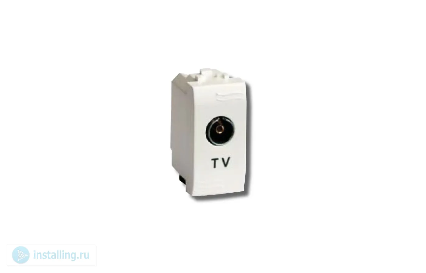 Розетка серии BRAVA телевизионная, с согласующим сопротивлением универсальная, диапазон рабочих частот 40...2200 МГц, коэффициент затухания менее 10 дБ, габаритные размеры 43х21,5, цвет белый