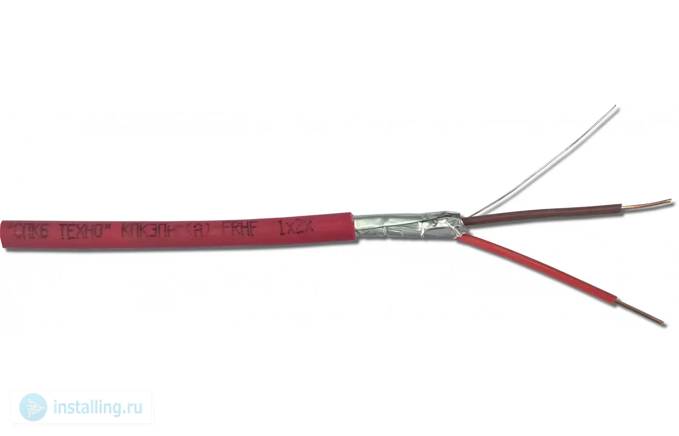 Кабель огнестойкий с изоляцией из огнестойкой кремнийорганической резины.В общем экране из алюмолавсановой ленты с контактным проводником из медной луженой проволоки. Оболочка из полимерной композиции, не содержащей галогенов, пониженной пожароопасности с низким дымо- и газовыделением. Пары с однопроволочными медными жилами D=0,2 кв мм. Оболочка красного цвета. Наружный размер кабеля D=4,9 мм.