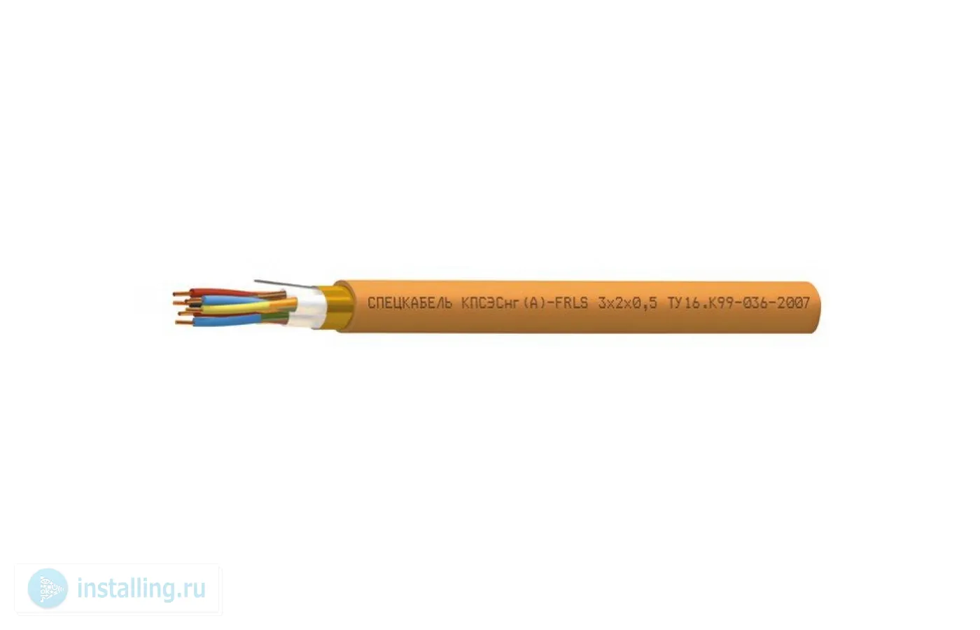 Однопроволочный, парной скрутки, 1х2х0.5 кв.мм, наружный размер кабеля Dн=6.9 мм; изоляция: кремнийорганическая керамообразующая резина; дополнительный огнестойкий барьер: слюдосодержащая лента; экран: общий из алюмолавсановой ленты с контактным проводником из медной луженой проволоки; оболочка: ПВХ пониженной пожарной опасности, с низким дымо- и газовыделением. Цвет оранжевый