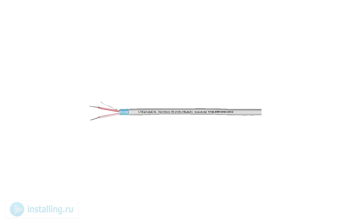 Пары со сдвоенными параллельными однопроволочными диаметром 0,52 мм медными жилами с изоляцией из огнестойкой кремнийорганической резины и легко разделяемой перемычкой между ними, с общим экраном из алюмолавсановой ленты и с контактным проводником из медной луженой проволоки, в оболочке из ПВХ пластиката пониженной пожароопасности с низким дымо- и газовыделением с низким показателем токсичности продуктов горения белого цвета. Идентификация жил в паре – по продольному наплыву и цветной полосе на одной из изолированных жил.