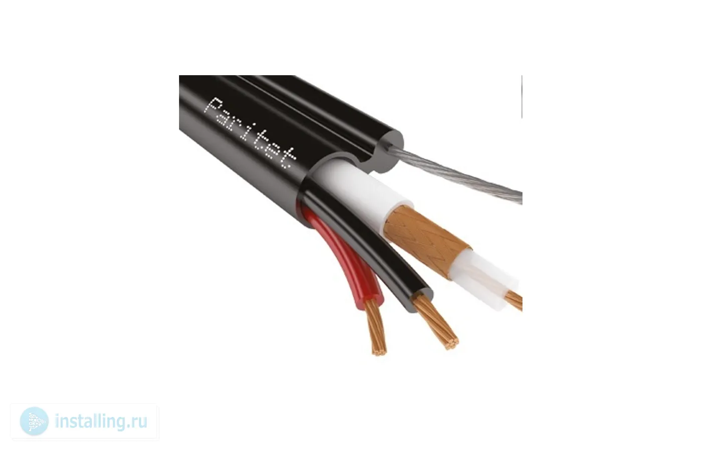 Кабель с коаксиальным рк75-2-13м проводником и 2 жилами для питания с внешней полиэтиленовой изоляцией, с несущим тросом. D-внешний = 13,5х8,0 мм, сечение жил = 0,5 кв. мм. Внутр. проводник 7х0,12 для внешней прокладки