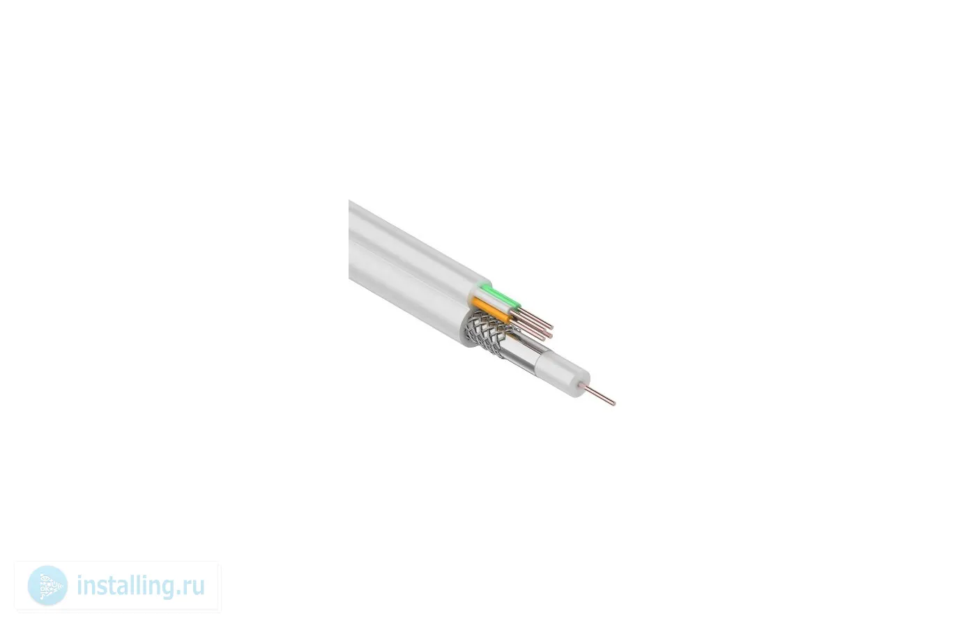 Кабель ККСВ-В+4х0.5 мм состоит из радиочастотного коаксиальногокабеля и двух жил питания. Коаксиальный кабель 3с-2v состоит из медного монолитного проводника, вспененного диэлектрика, внешнего проводника из алюминиевых жил в виде оплётки и оболочки из ПВХ. Жилы питания медныемонолитные в изоляции и оболочке из ПВХ. Коаксиальный кабель и жилы питания соединены между собой.