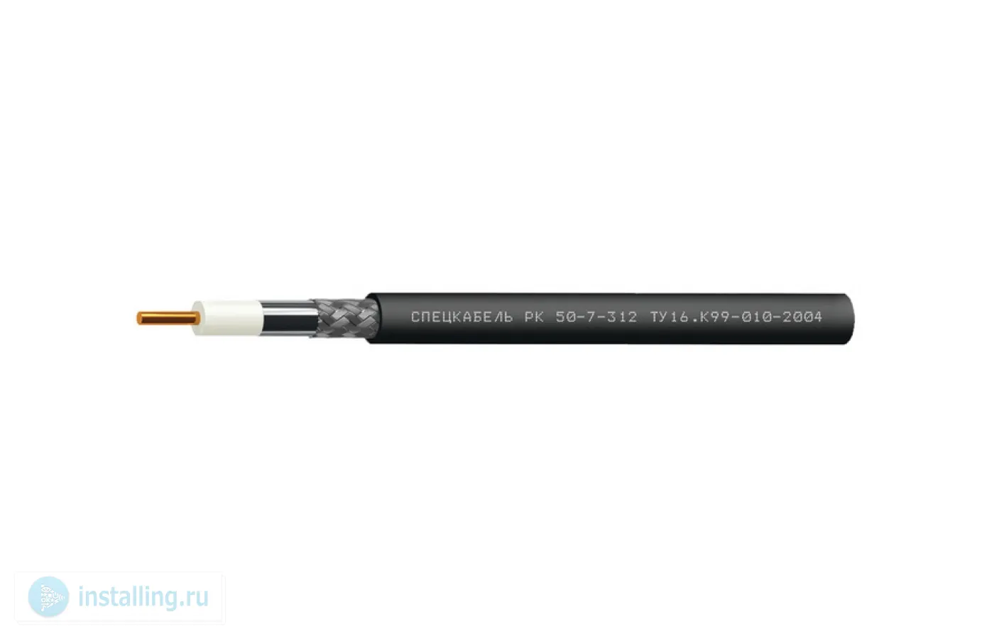 Одиночной прокладки; однопроволочный медный проводник диаметром 2,74 мм; Наружный размер кабелей, DH, не более 10,3 мм; Изоляция: полиэтилен физического вспенивания диаметр по изоляции 7,25 мм ; Внешний проводник: оплетка плотностью 88–92из медных луженых проволок диаметром 0,12 или 0,15 мм, наложенная поверх ламинированной алюминиевой фольги диаметр по внешнему проводнику 8,0 мм ; t-раб.–50...+70°С; Оболочка: ПВХ; Цвет: черный