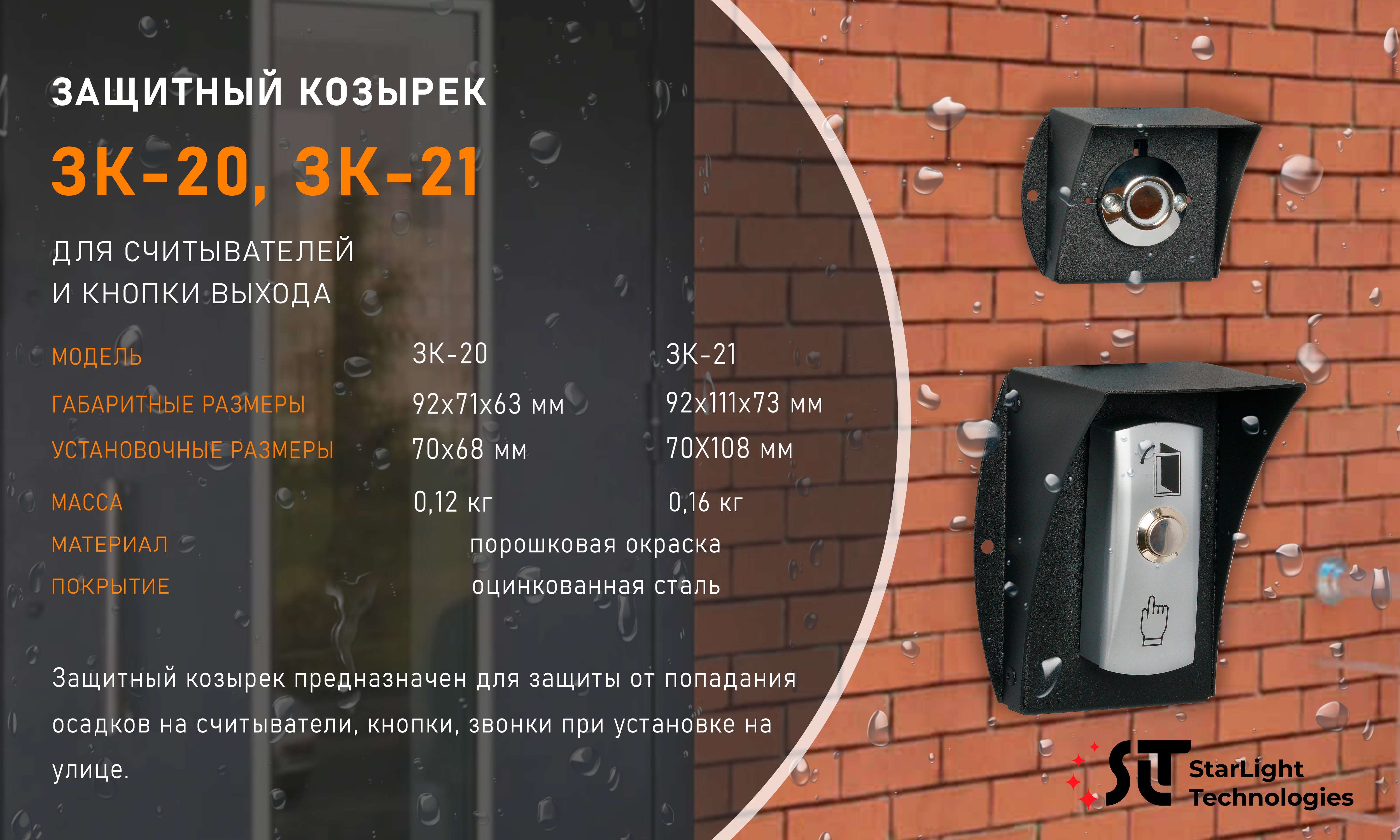 Защитный козырек для установки считывателей, кнопок звонков, габаритный размер 92х111х73 мм, установочные размеры не более 70х108 мм, вес 0,16 кг.