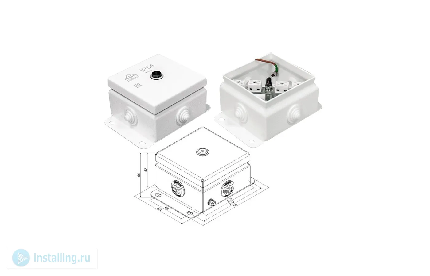 Огнестойкая, керам.колодка 14 х 6 мм?, 4 ввода под кабель O ? 12 мм, IP 54, t - раб.-50…+130°С, габ.размеры 103 х 103 х 62 мм, оцинкованная сталь с полимерной окраской.