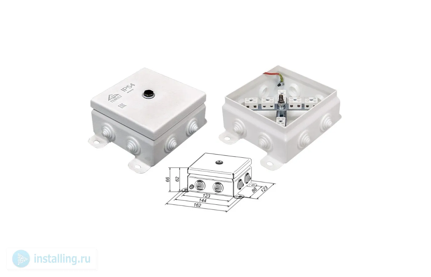 Огнестойкая, керам.колодка 12 х 3 мм?, 8 вводов под кабель O ? 12 мм, IP 54, t - раб.-50…+130°С, габ.размеры 123 х 123 х 62 мм, оцинкованная сталь с полимерной окраской