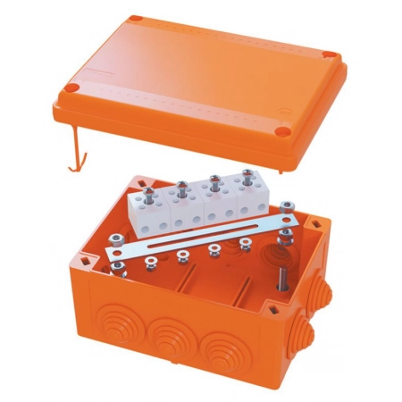 Коробка ответвительная серии FS из термопласта с кабельными вводами и клеммниками, 100х100х50 мм, IP55, количество вводов 6 шт, номинальный диаметр вводов 25 мм, количество полюсов 4 шт, сечение провода 4 кв.мм, 450 V, ток 6 A, время работоспособности при пожаре не менее 45 мин, цвет оранжевый