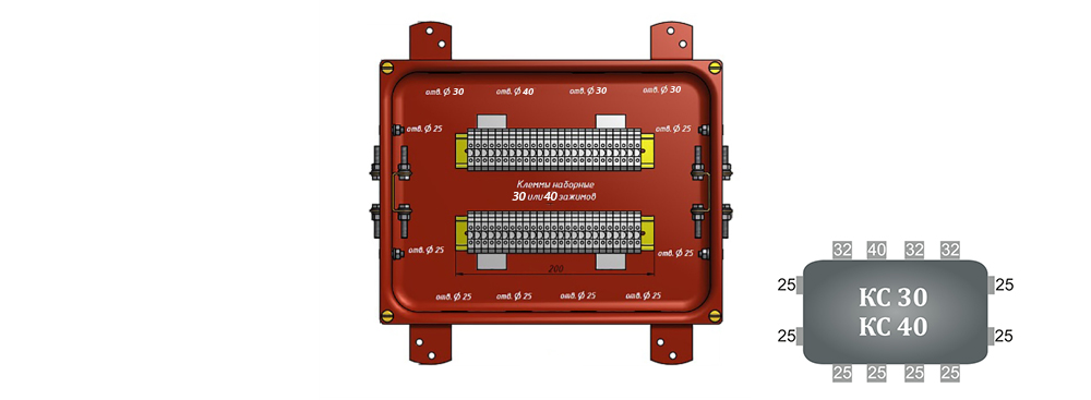 С латунными сальниками; сечение жил до 4 кв.мм; Количество зажимов: 30 шт; Номинальный ток до 25A; Материал изготовления: оцинкованная сталь; Покрытие: грунтовое; Напряжение переменного тока: 660 В; Напряжение постоянного тока: 440 В; Климатическое исполнение: У 1,5; t-раб.-40…+60°С; IP54; Тип вводов: Ввод-пирамидка PVC; Параметры вводов: М25 8-16ммх4, М32 14-25ммх3, М40 22-30ммх1; размеры 340х370х110 мм