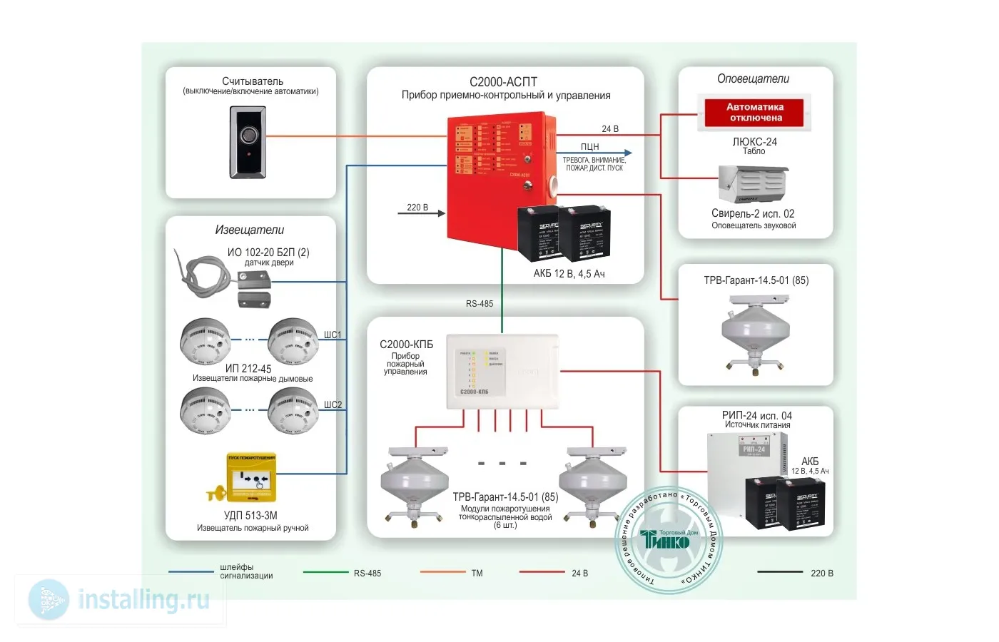 Типовое решение для построения системы противопожарной защиты помещений построено на базе оборудования производства ГК «ЭТЕРНИС» и НВП "Болид". Центральным оборудованием системы является прибор приемно-контрольный и управления С2000-АСПТ, а также модули пожаротушения тонкораспыленной водой «ТРВ-Гарант-14,5-01 (85)».Прибор может использоваться совместно с блоками «С2000-КПБ» (до 97), позволяющими увеличить количество пусковых цепей или зон пожаротушения.