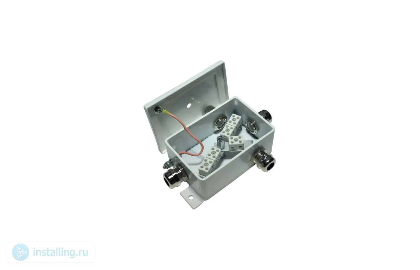 Корпус коробки целиком изготовлен из стали 2,5-3 мм. Имеет двойную защиту от коррозии (гальваническое покрытие и покраска). Крышка прижимается к корпусу через силиконовую прокладку. Винт крепления крышки снабжен уплотняющей тарельчатой шайбой с фторопластовым покрытием. Внутри корпуса коробки установлены керамические клеммные колодки, обеспечивающие соединение "под винт", и клемма заземления. В боковых стенках устанавливаются металлические кабельные вводы. Крепление коробки к элементам конструкций рекомендуется осуществлять на приварные пластины с применением гаек и винтов или с помощью саморезов и металлических дюбелей.