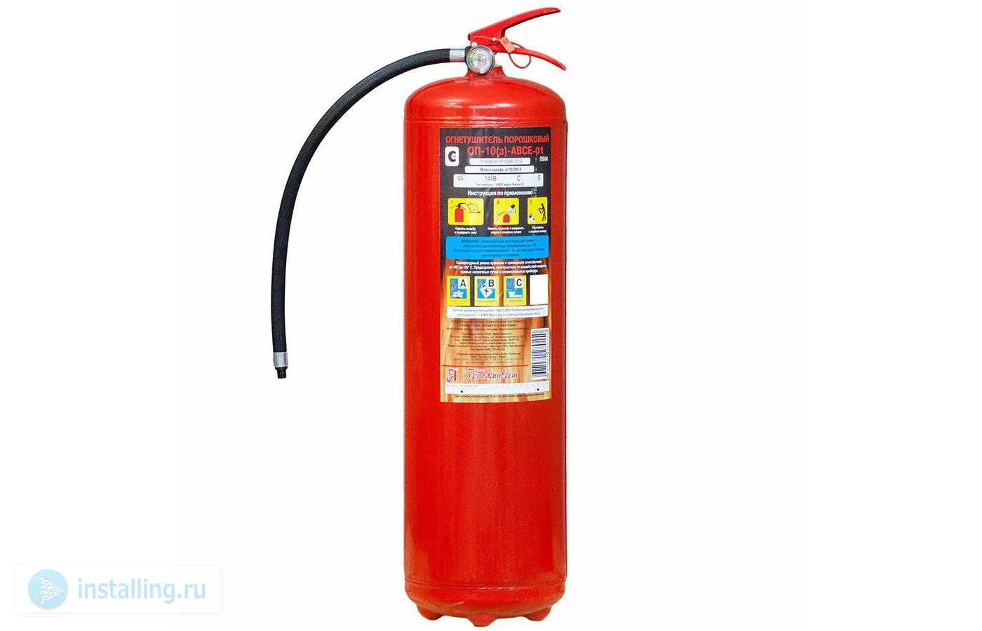 Огнетушитель порошковый закачной, вместимость корпуса 11.6 л, масса заряда порошка 10 кг, длина струи 4 м, продолжительность подачи 15 сек, огнетушащая способность 144В/4А, t-раб.-40…+50°С, 170х170х655мм. Шланг с насадком в комплекте.