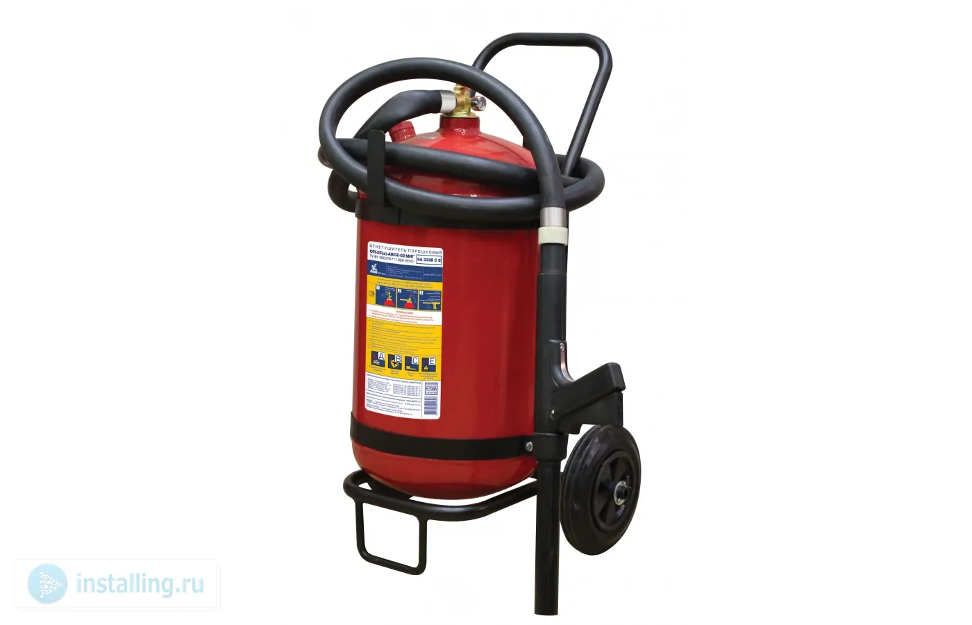 Огнетушитель порошковый закачной с повышенной огнетушащей способностью. Для тушения пожаров классов 10А, 233В, С, Е ; вес огнетушащего порошка 25 кг; марка порошка «Вексон-АВС 50»; объем баллона 32 л; габ.размеры 800х430 мм; t-раб.°С -50...+50, вес 50 кг. Поставляется с съемной тележкой, обрезиненные 200 мм колеса, морозостойкий резиновый распылитель.