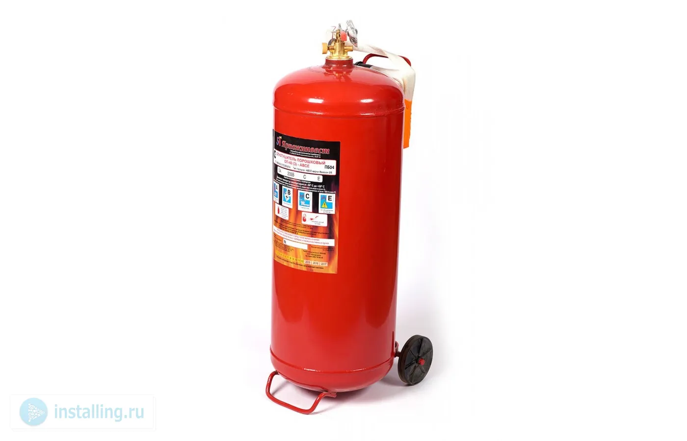 Огнетушитель порошковый закачной, вместимость корпуса 50.2 л, масса заряда порошка 40 кг, длина струи 6 м, продолжительность подачи 20 сек, огнетушащая способность 6А, диапазон рабочих температур -50…+50°С, длина шланга 3 м