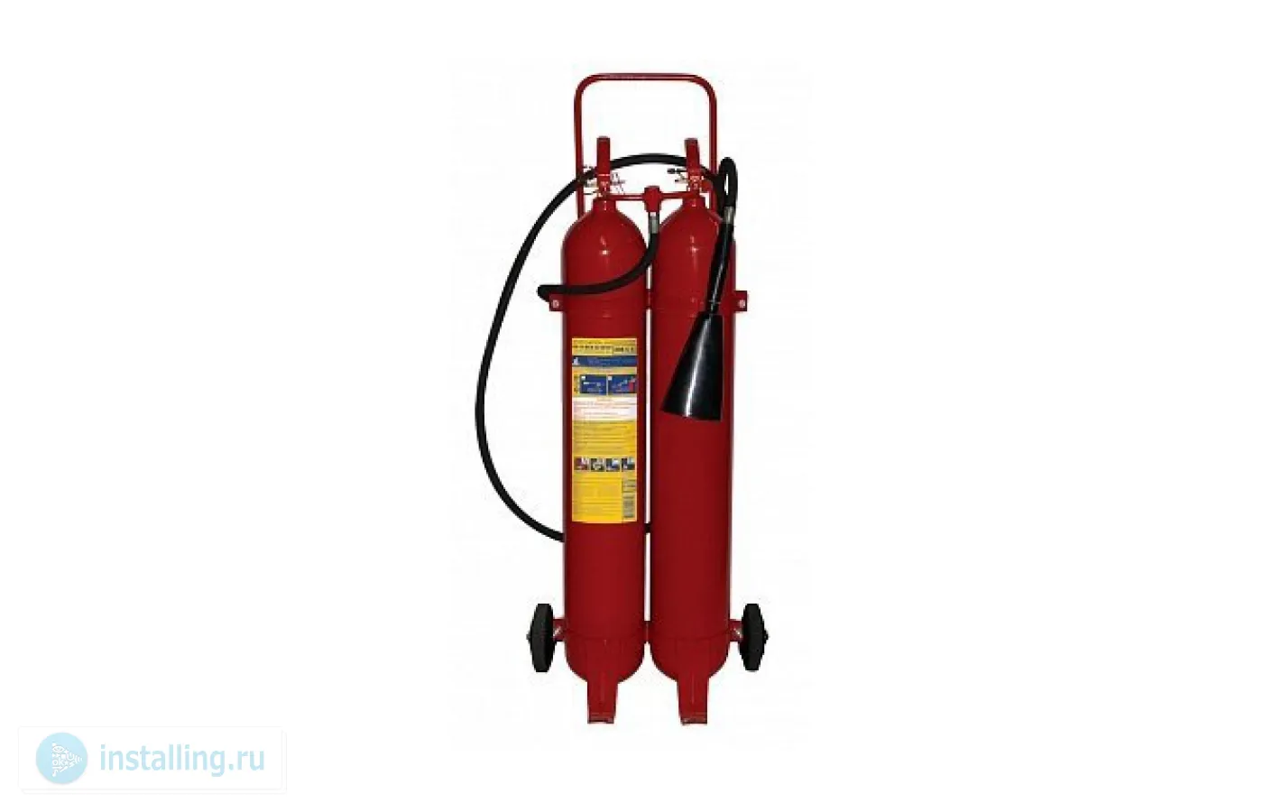 2 баллона на тележке , огнетушащая способность 89В, С, Е;масса огнетушащего вещества 15-0.75 кг, продолжительность подачи ОТВ 15 сек, t-раб.-40…+50°С, габ.размеры высота, ширина по длине шасси1050х420 мм, 50 кг