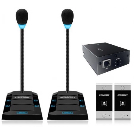 Комплект клиент-кассир с меткой конфликтных ситуаций и системой записи переговоров, 2400 часов на MicroSD карту, сенсорное управление, линейный выход, антивандальная панель, уголок, подсветка микрофона, в комплекте: 2-канальный аудиорегистратор Sprut SR-500/2 + 2 переговорных устройства STELBERRY S-425 + комплект для коммутации + блоки питания