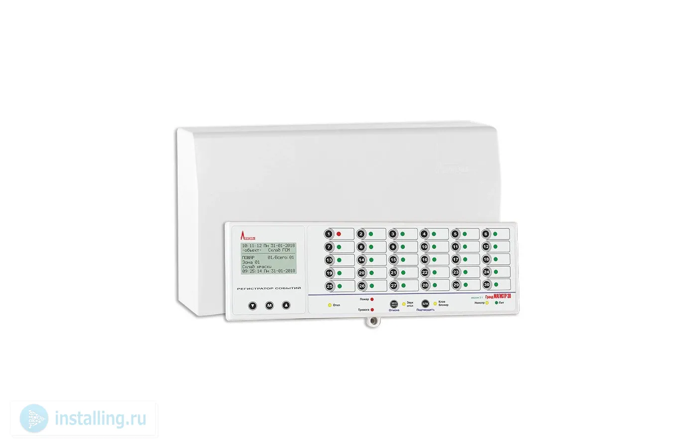 ППКОП 30ШС с выносной клавиатурой до 500 м, до 5 клавиатур с информативным графическим ЖК-дисплеем и встроенной подсветкой, встроенный регистратор на 1024 события, напряжение шлейфа 17...20В, ток в шлейфе сигнализации в дежурном режиме 2.1 мА, RS-485, подключение модуля Ethernet СА+LAN, подключение релейных модулей на 4,8 или 16 реле; U-пит. 11...14 В, ток потребления 0.29 А; 4 раздела, 3 реле с перекидным контактом 24В/2А, 4 выхода типа «открытый коллектор» 12В/0.5А, выход питания внешних устройств 12В/1.2А; t-раб. ППКОП -30...+55°С, t-раб. клавиатуры +5...+55°С; габаритные размеры системного блока 345х180х90 мм, клавиатуры 295х95х32 мм