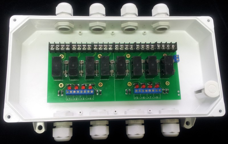 Блок релейный, 8 реле, контакты на переключение; U-упр. 12 В; I-упр. <55 мА; U-коммут. до 250В; I-коммут. до 8 А; IP55; t-раб. -30...+50°С; габ.размеры 302х225х93 мм. Клеммник T31, S? кабеля до 2,5мм?. 8 герметичных кабельных вводов PG16 под кабель O 9...14 мм.