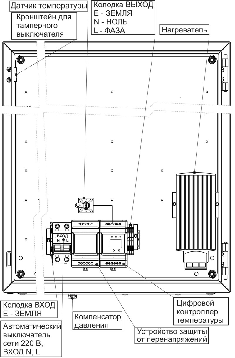 С автоматикой управления климатом; U-пит.170...250В, I-нагр.5 А, P-нагрев.100 В; выход АВАРИЯ; IP65, t-раб.-45...+50С, 600х600х250 мм, 21 кг.
