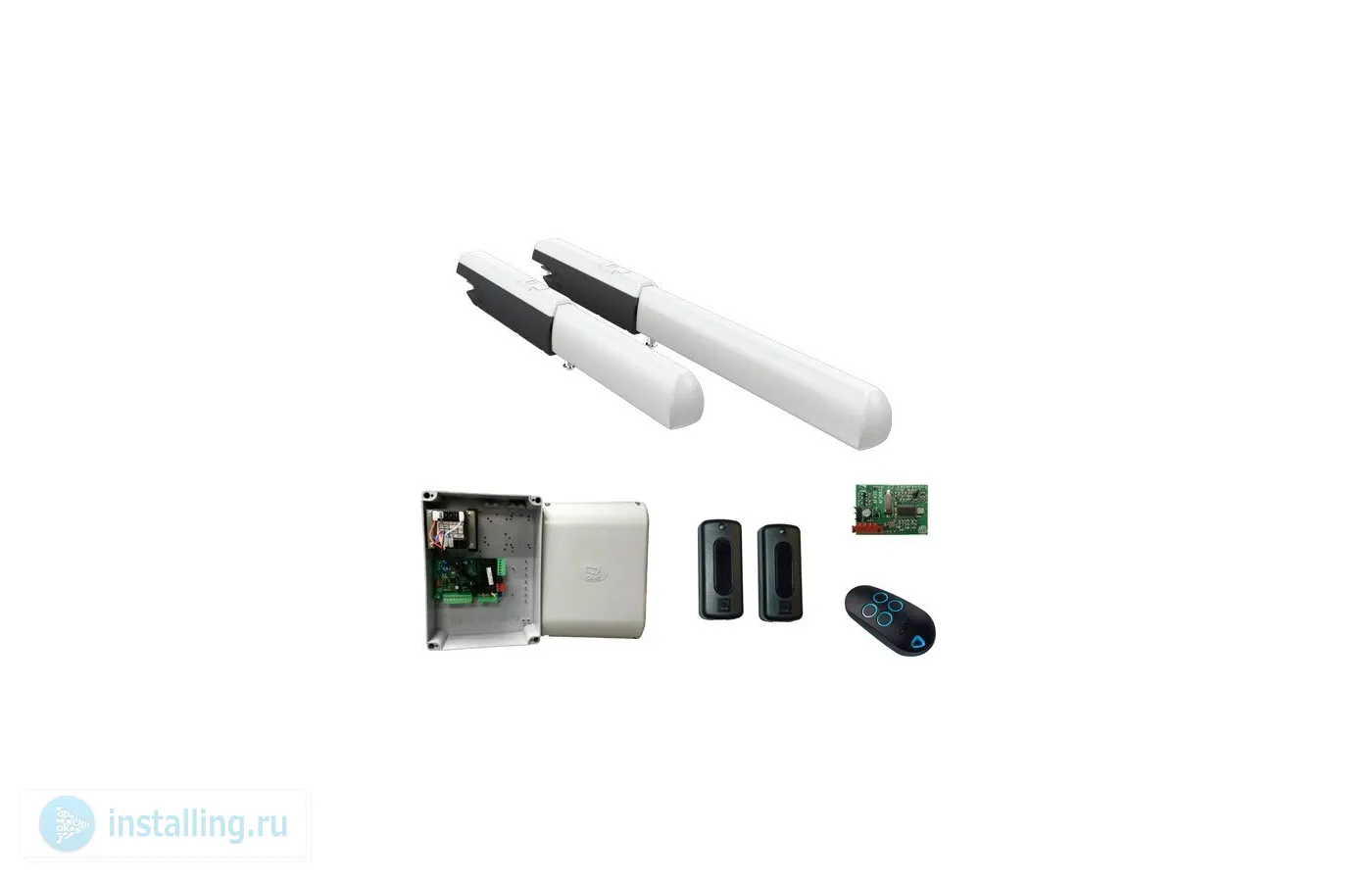 A3000A - Привод 230 В линейный самоблокирующийся для створки до 5 м и массой 1000 кг - 2 шт, ZF1N - Блок управления-1 шт., AF43S - Плата-радиоприемник 433.92 МГц-1 шт., TOP44RBN - Брелок-передатчик 4-х канальный с динамическим кодом -1 шт., DIR10 - Комплект фотоэлементов / передатчик, приемник / накладные, дальность 10 м -1 шт. Линейный привод для створки до 5 м, до 1000 кг, 230 В, время открывания на 90° - 32 с, 150 Вт, IP44, -20...+55°C. Интенсивность использования 50%