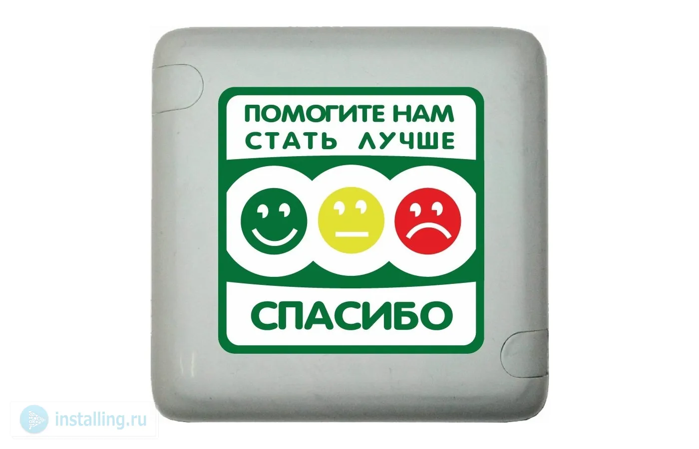 Радиокнопка оценки качества с 3-мя кнопками «Отлично»/«Удовлетворительно»/«Плохо». Звуковое подтверждение нажатия кнопок. 433,92 мГц, 10 мВт, дальность до 70 м в прямой видимости, накладной монтаж, 82х82х18 мм
