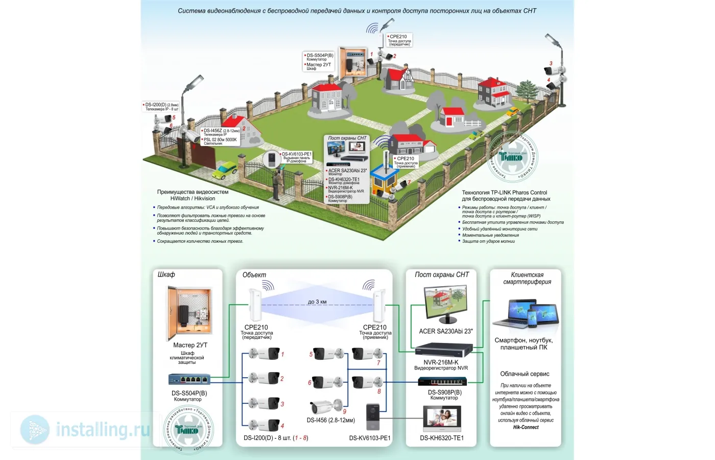 За периметром садового некомерческого товарищества (СНТ) и контроля доступа посторонних лиц реализовано на оборудовании HiWatch, Hikvision, TP-Link, Телеком-Мастер и предназначено для: - обеспечения визуального контроля за периметром СНТ и въезжающим/выезжающим транспортом - обнаружения опасных ситуаций (проникновение на охраняемую территорию посторонних лиц, возгорания) - передачи данных от видеокамер на пост охраны СНТ в режиме прямой трансляции - записи информации от видеокамер на видеорегистратор - контроля доступа посторонних лиц через калитку - предоставления возможности жителям СНТ просматривать видео с камер через облачный сервис Hik-Connect на смартфоне.