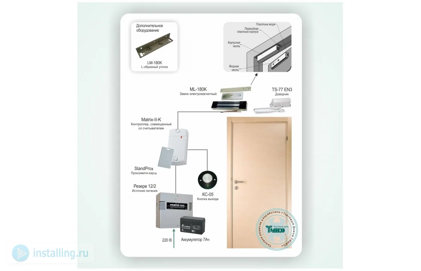 Предлагаемое типовое решение автономной СКД (офисные и жилые помещения) реализовано на базе Matrix-II-К — считывателя proximity-карт, совмещенного с контроллером. Основной задачей данной СКД является предотвращение доступа посторонних. Вход осуществляется по карте, выход при помощи нажатия на кнопку выход.