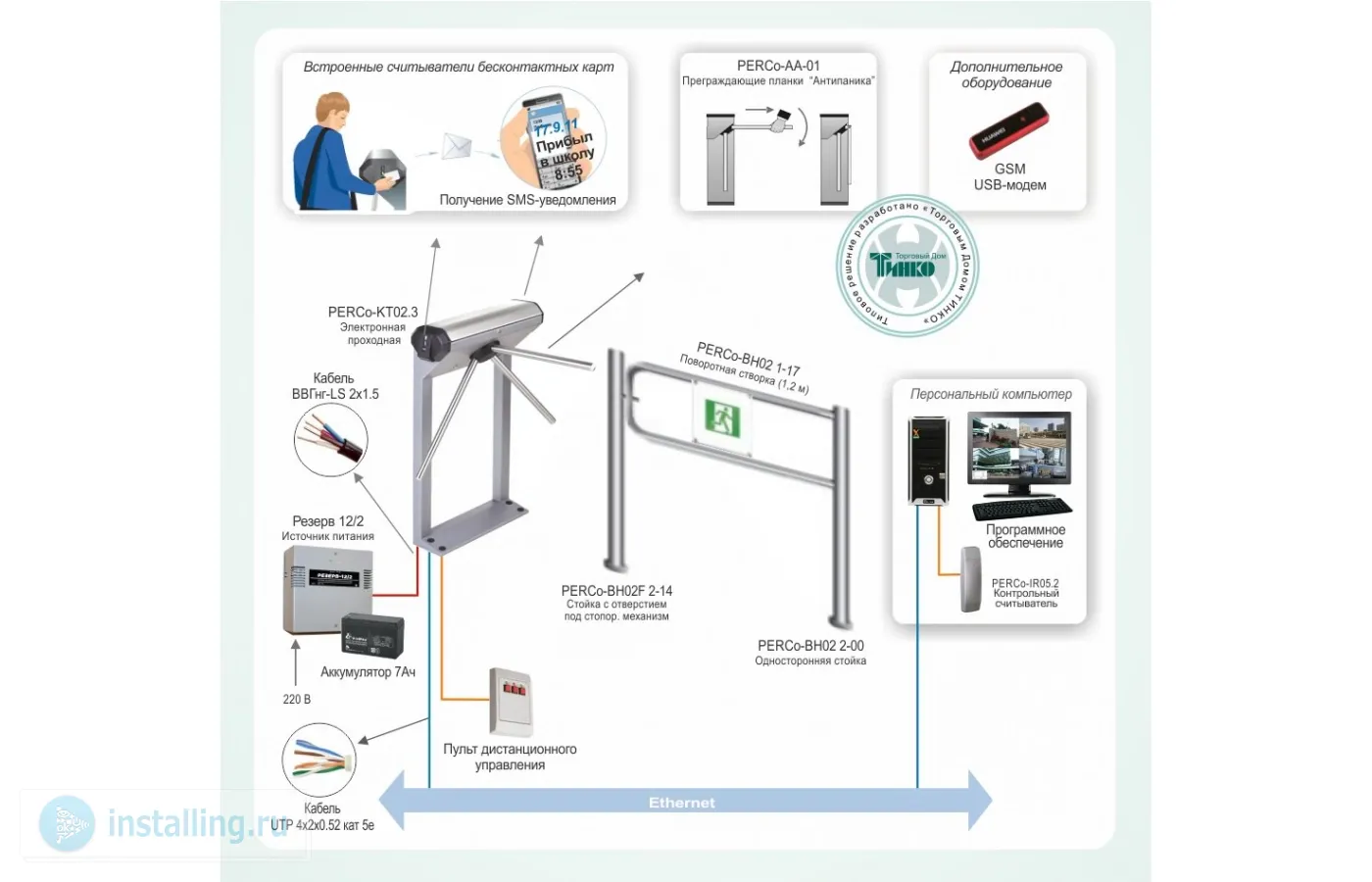 Предлагаемое типовое решение системы контроля доступа (СКД) реализовано на базе электронной проходной PERCo-KT02.3. СКД «Школа» — это готовое экономичное решение для организации контроля доступа в учебное заведение. Система не только предотвращает проникновение посторонних, но и с помощью SMS-сообщений уведомляет родителей о времени прихода ребенка в школу и ухода из нее.