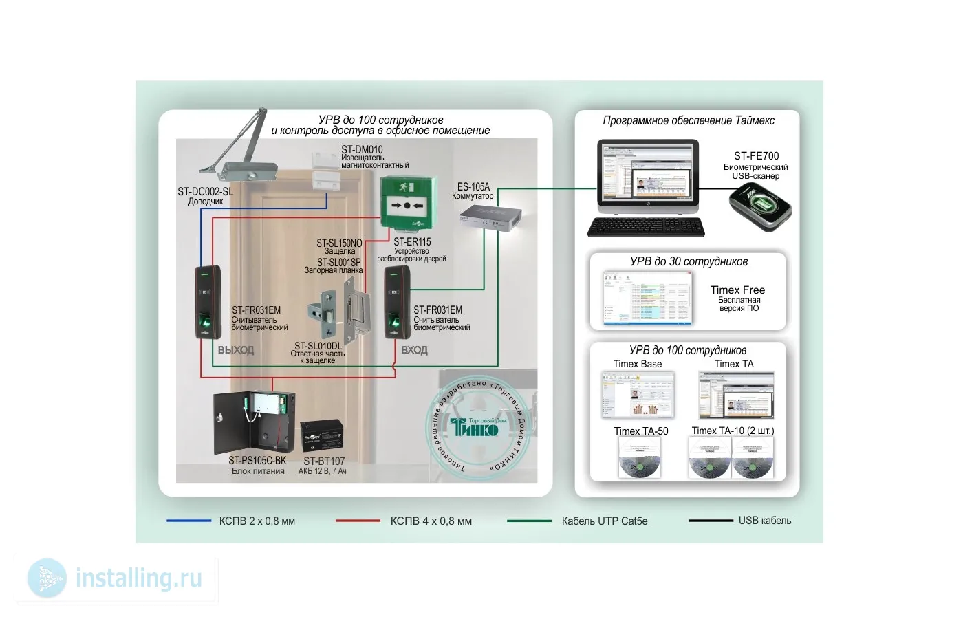 Типовое решение системы учета рабочего времени (СУРВ) с контролем доступа в офисное помещение реализовано на базе сетевых контроллеров Smartec c идентификацией персонала по биометрическому признаку - отпечаткам пальцев.