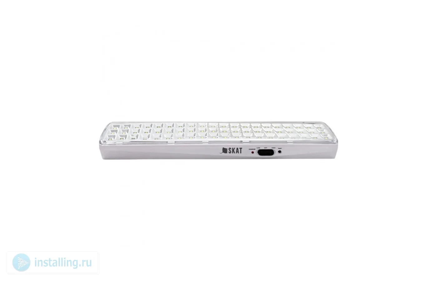 60 светодиодов, 60 х 2500 мКд; U-пит.110...240 В, Li-Ion АКБ 3.6В 2400 мАч, 2 режима работы; время резерва до 3/6 часов; поворотные кронштейны для потолочного крепления, 2 варианта настенного крепления; защита АКБ от перезаряда и глубокого разряда; IP 20, t раб. +5...+40°С, 362 х 65 х 36мм