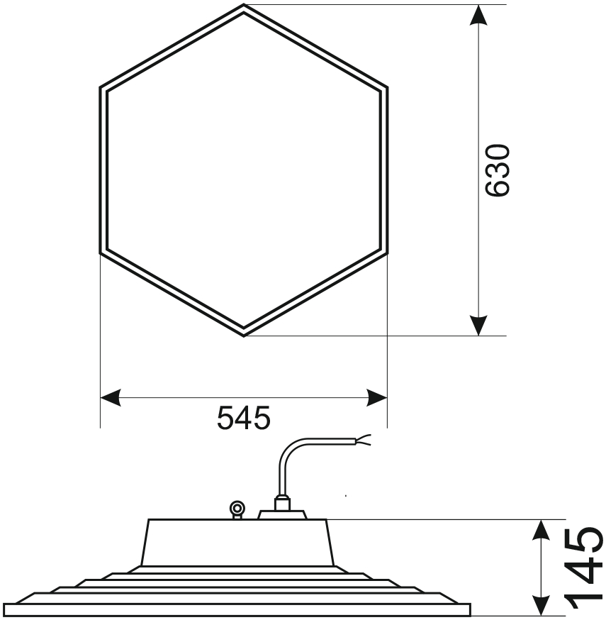 Промышленный светильник с центральным подвесом; световой поток 17600 лм, цветовая температура 5000 К; U-пит.176...264 В, P-потр.120 Вт; IP65, t-раб.-20...+40°С, 630х545х145 мм, 3.15 кг.