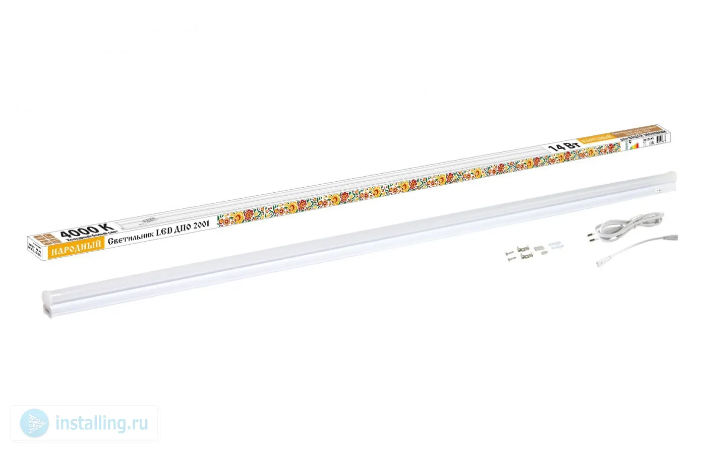 Мощность 14 Вт, световой поток 1200 Лм, цветовая температура 4000 K, U-вх. 180...265 В, IP40, t-раб.–10...+40°C, габ.размеры 1178 ?22?34 мм.