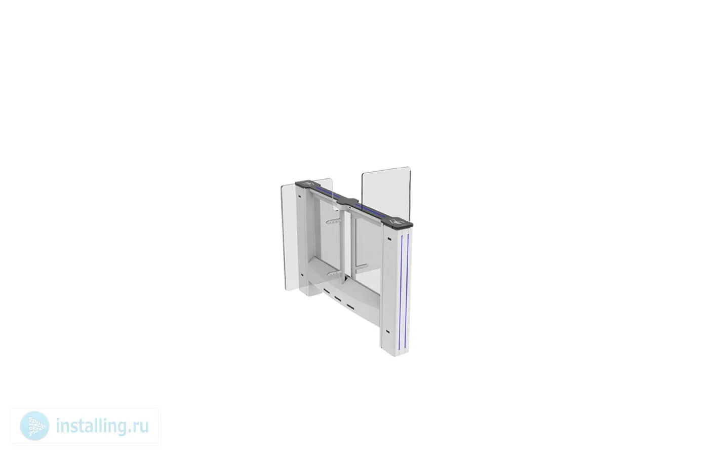 Центральный модуль распашного турникета. Светодиодные указатели прохода и направления. Корпус - нержавеющая сталь. Сервопозиционный электропривод створки с определением препятствий и автоматической разблокировкой при отключении электроэнергии. Створка из 10 мм закаленного стекла. Ширина прохода 900 мм. Высота створки 1200 мм. Время открытия 2.2 сек. Встроенный блок питания. IP44.