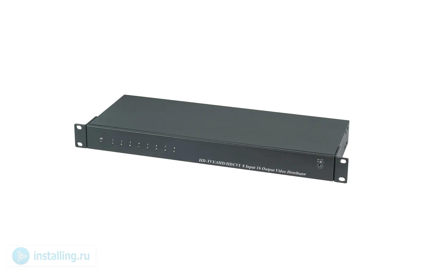 Разветвитель HDCVI, HDTVI, AHD, CVBS 8вх./16вых.. Поддержка NTSC, PAL. Встроенная защита от скачков напряжения TVS; DC12В/500мА поддерживает диапазон входных напряжений DC9-24В; 483х44х105.5мм. ; -40...+55°C.; Монтаж в стойку 19; Блок питания в комплекте