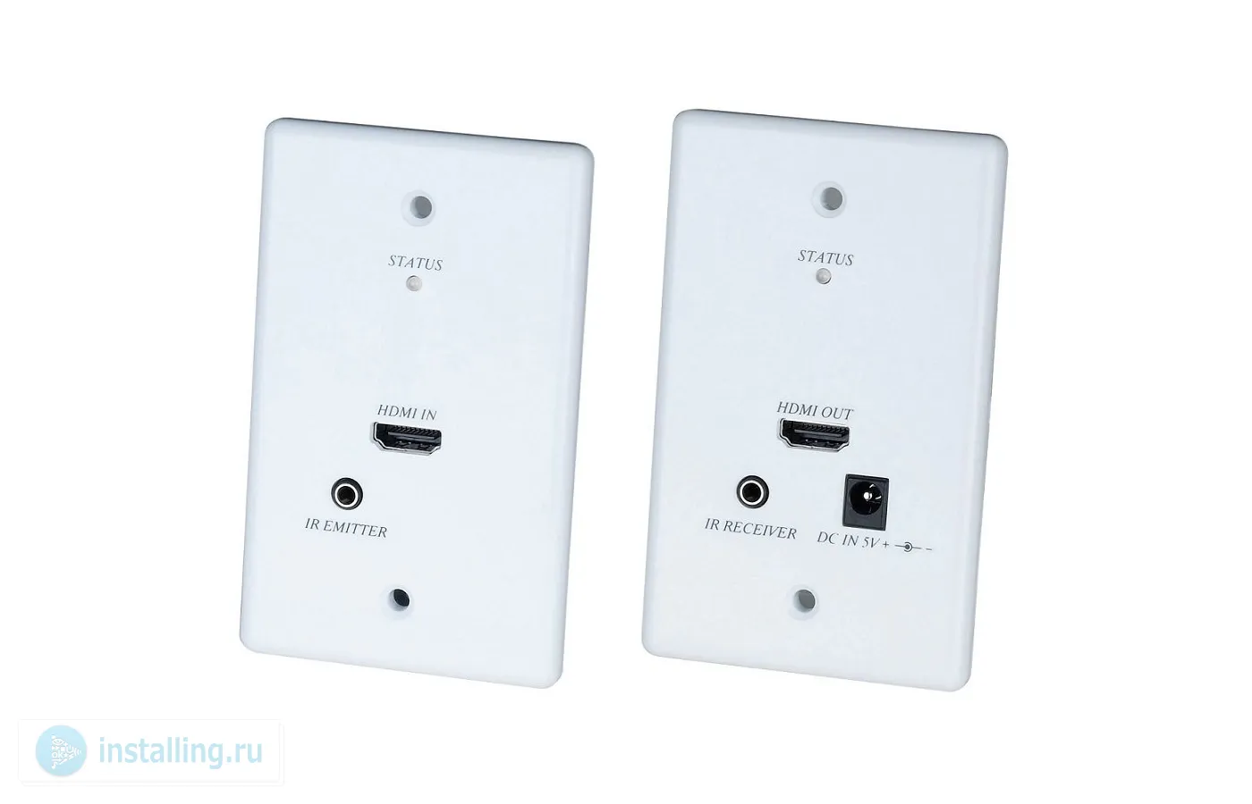 Комплект передатчик +приемник передачи HDMI 1.3 с обратным ИК-повторителем; Передает сигналы по двум кабелям витой пары CAT5/5e/6 на расстояние до 100 м. при разрешении 480i / 576i / 480p / 576p, до 70м при разрешении 1080i, до 30м. при разрешении 1080p; 70.3x115x33мм.; Выполнен в виде настенных врезных розеток