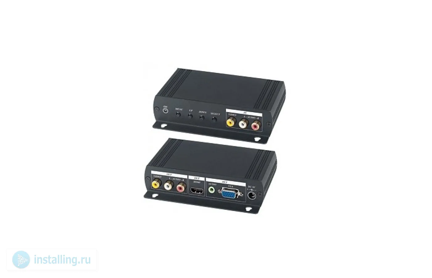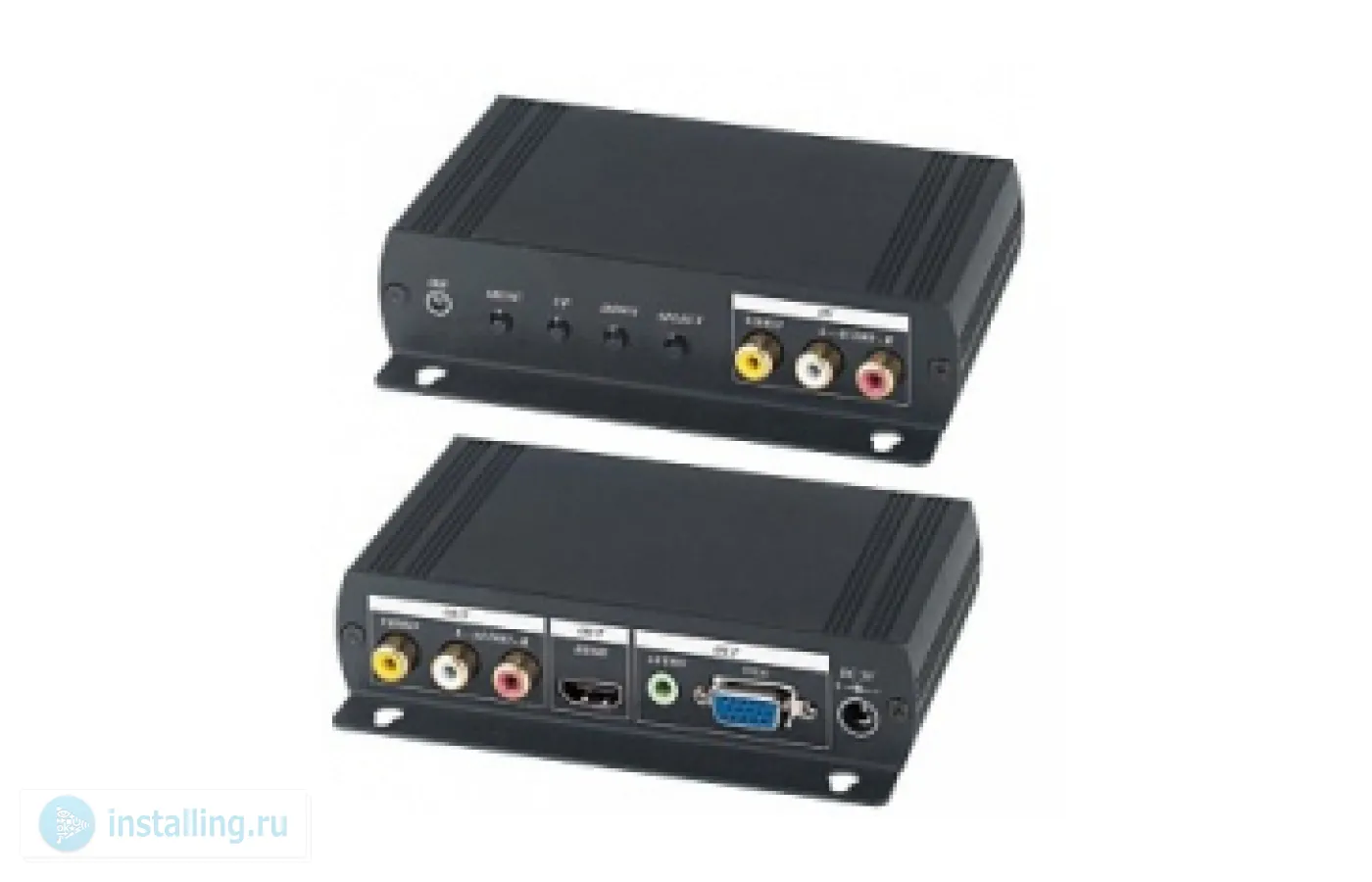 Преобразователь аудио и композитного видеосигнала в VGA и HDMI. Входы - композитный видео и стереоаудио. Выходы - композитный видео и стереоаудио, VGA, HDMI. Разрешение VGA -до 1920х1080, HDMI -до 1080p. OSD меню. БП 220/5В, 1А DC в комплекте. Размеры 140х97х32мм
