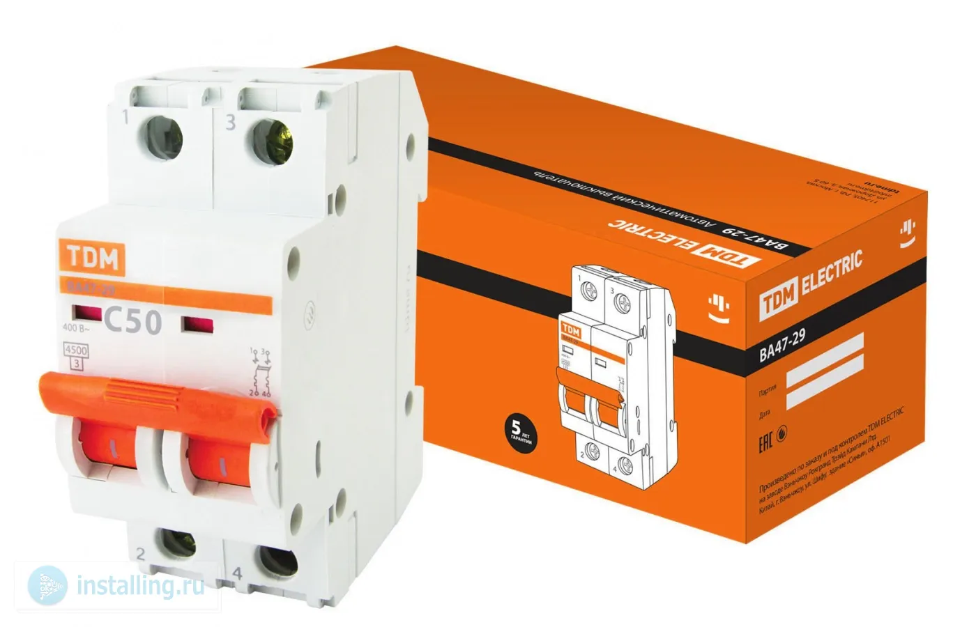 На DIN-рейку, 2-полюсный, номин. отключающая способность 4.5кА, характер.срабатывания С, I-номин. 50 А