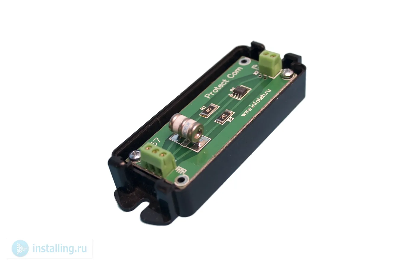 Устройство грозозащиты цепей передачи AHD/CVI/TVI/CVBS видеосигналов по коаксиальному кабелю при ударах молнии; Двухуровневая защита по напряжению от 5,6В с Рmax.= 400 Вт, время срабатывания 5 нс / от 90В Imax=10КА, время срабатывания – 8/20 мкс; Дифференциальная и синфазная защита; Полоса пропускания до 100МГц; Вход, выход – под клеммы; 110х36х26 мм.; –40°...+50°C.; Адаптировано для установку на DIN - рейку с использованием монтажной планки AVT-DIN01.