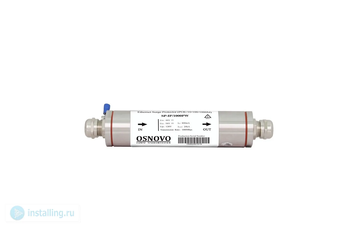 Уличное устройство грозозащиты для локальной вычислительной сети скорость до 1000 Мб/с с защитой линий PoE af/at, методы A + B, контакты 1/2, 3/6, 4/5, 7/8; Двухступенчатая защита; 1 вход RJ45-мама, 1 выход RJ45-мама; Промышленное исполнение: корпус из нержавеющей стали, класс защиты IP67; -40…+80°С; 175x34x34 мм.