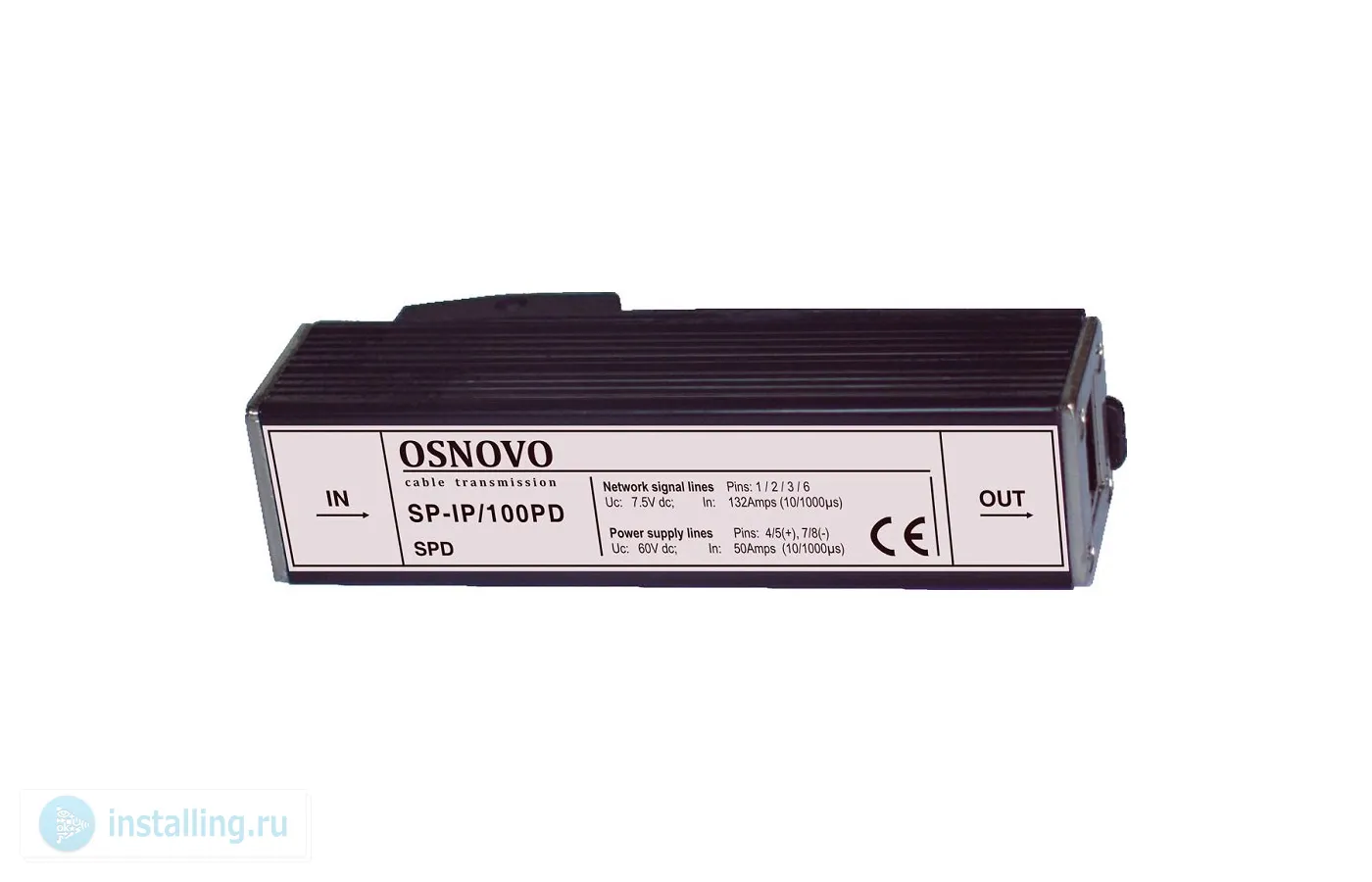 Устройство грозозащиты для локальной вычислительной сети скорость до 100 Мбит/с с защитой линий PoE af/at, метод B, контакты 4/5, 7/8, двухуровневая защита. 1 вход RJ45-мама, 1 выход RJ45-мама; Монтаж на DIN-рейку; -40…+80°С; 26x120x27 мм.