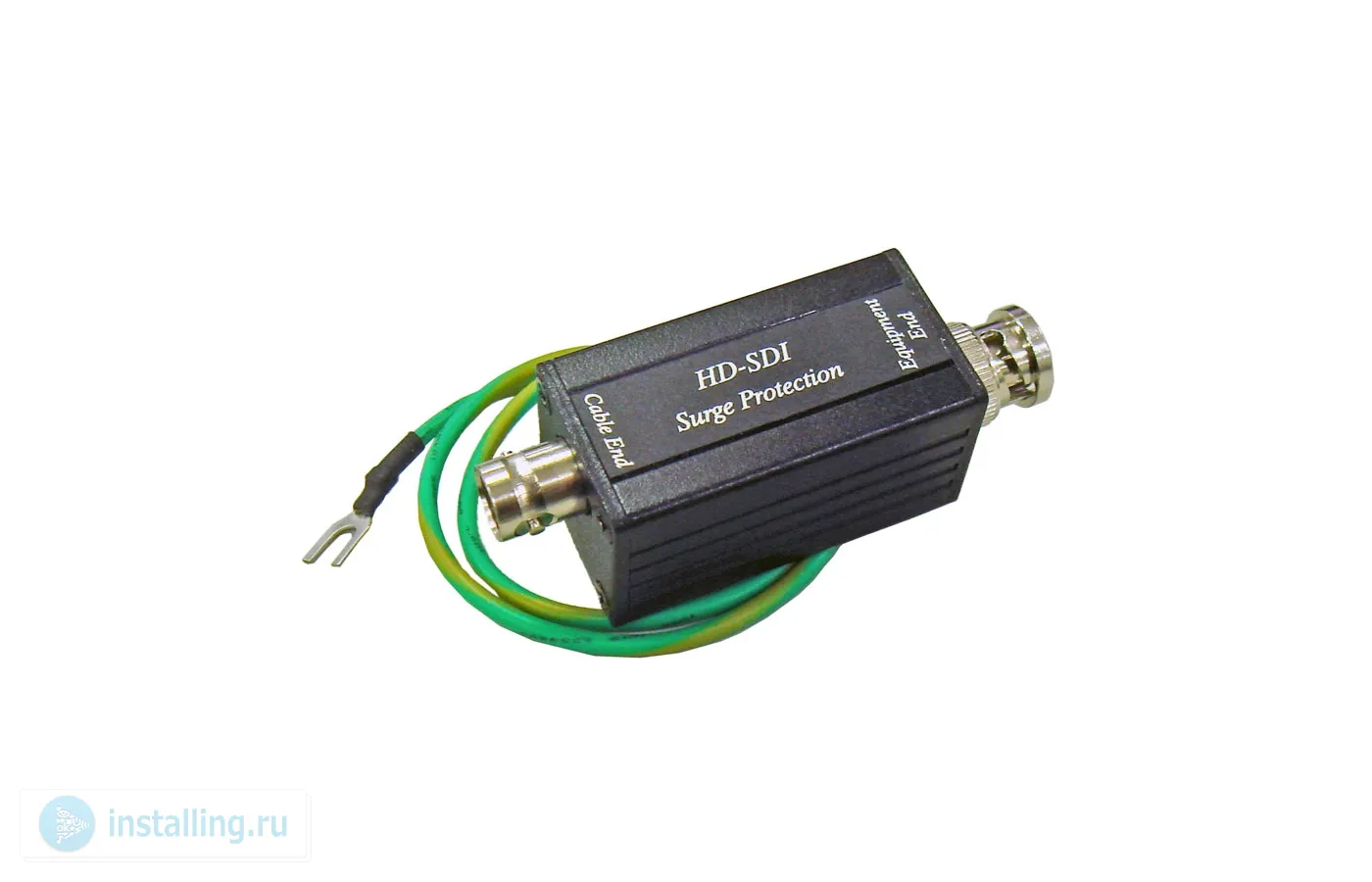 Устройство грозозащиты для цепей передачи видеосигналов формата SDI HD-SDI, 3G-SDI. Полоса пропускания до 2.7Гб/с. Максимальный ток разряда 10кА. Максимальное напряжение 8кВ. Время отклика не более 1нс. Вход линия- BNC розетка, выход к оборудованию- BNC штекер. Размеры 75.5х25.4х25.4мм.