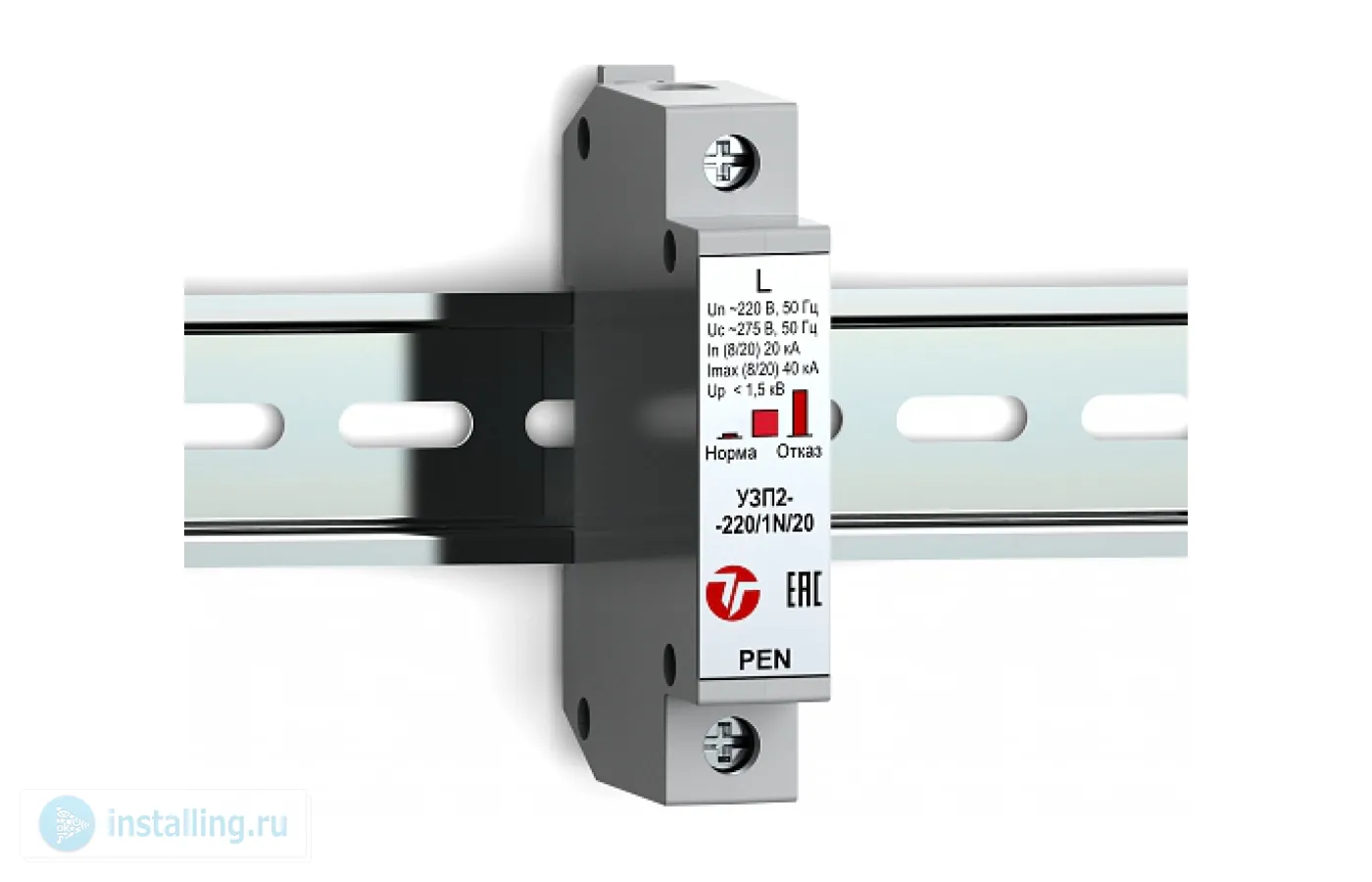 Однофазное устройство защиты электрооборудования распределительных сетей 220 В от импульсных перенапряжений; индикатор состояния аварийного отключения; U-раб.220 В; 92 х 74,5 х 17,8 мм, t - раб. - 55...+ 85°С. Крепление на DIN-рейку.