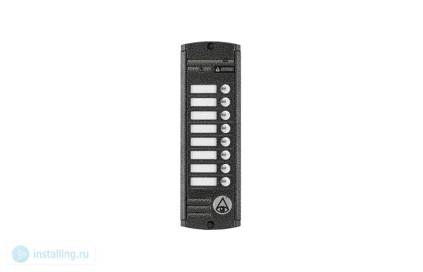 Вызывная видеопанель на 8 абонентов, накладная, 4-х проводная, 600 ТВЛ, ИК-подсветка, питание 12 В, -50…+50°C, IP55, 215х70х20 мм, цвет серебро