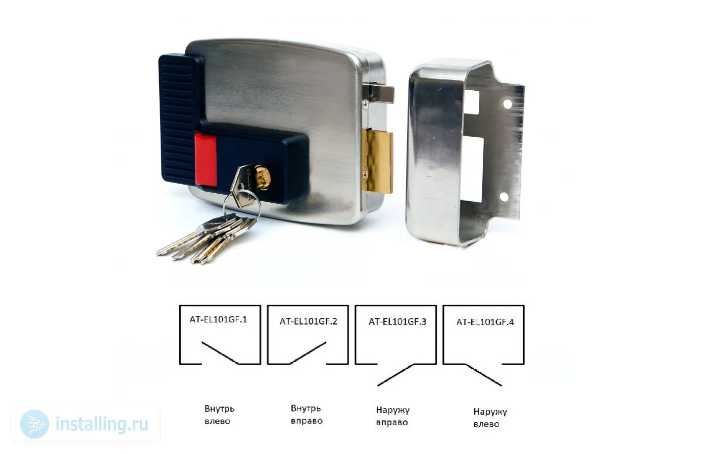 AT-EL101GF.1 (внутренний правый); НЗ; 12В DC; 3,5 А; -30 +50°C; время управления не более, сек 1; материал корпуса никелированная сталь; 148х107х35 мм; 1,3 кг Способ установки: дверь открывается внутрь в правую сторону