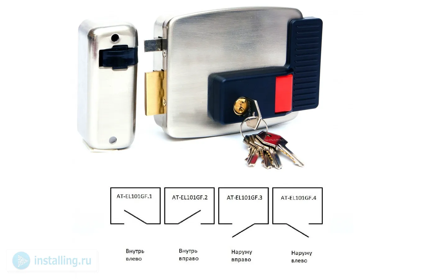 AT-EL101GF.1 (внутренний правый); НЗ; 12В DC; 3,5 А; -30 +50°C; время управления не более, сек 1; материал корпуса никелированная сталь; 148х107х35 мм; 1,3 кг Способ установки: дверь открывается внутрь в правую сторону